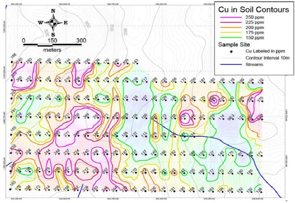 A 300 by 500 metre plus area defined by Cu in soil values greater than 225 parts per million ("ppm"); and