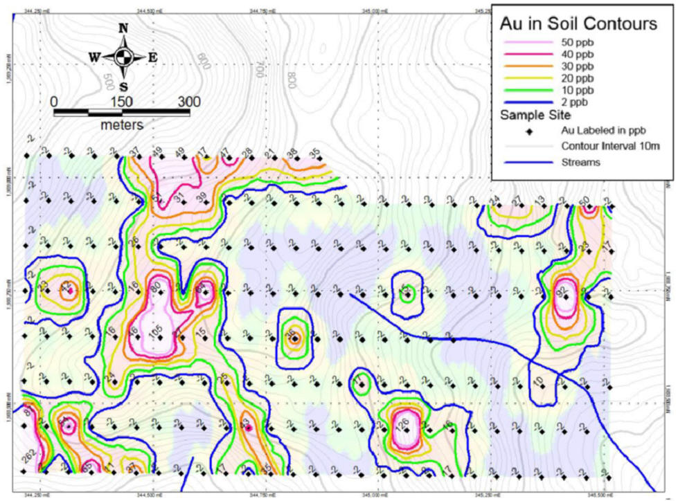 Associated anomalous gold (Au) values up to 105 parts per billion ("ppb") and molybdenum ("Mo") values up to 0.93 ppm