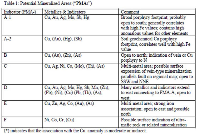 Within the current Dunrobin sample grid, other areas of anomalous Cu in soil values were also defined (Figures 1 and 3), commonly in association with base metal, precious metal and respective indicator elements (Figure 3 and Table 1). These associations suggest the presence of sub-cropping mineralization other than porphyry mineralization and/or metal zonation around a copper porphyry. The one exception to this is an area (PMA-B on Figure 3) to the north of the designated copper porphyry, which could well represent an appendage to a porphyry located to the north of the current sample grid. Follow-up sampling at Dunrobin will focus to the south of the existing grid and will extend the grid north to cover the copper mineralization previously indicated at the Diggins Ridge Prospect.