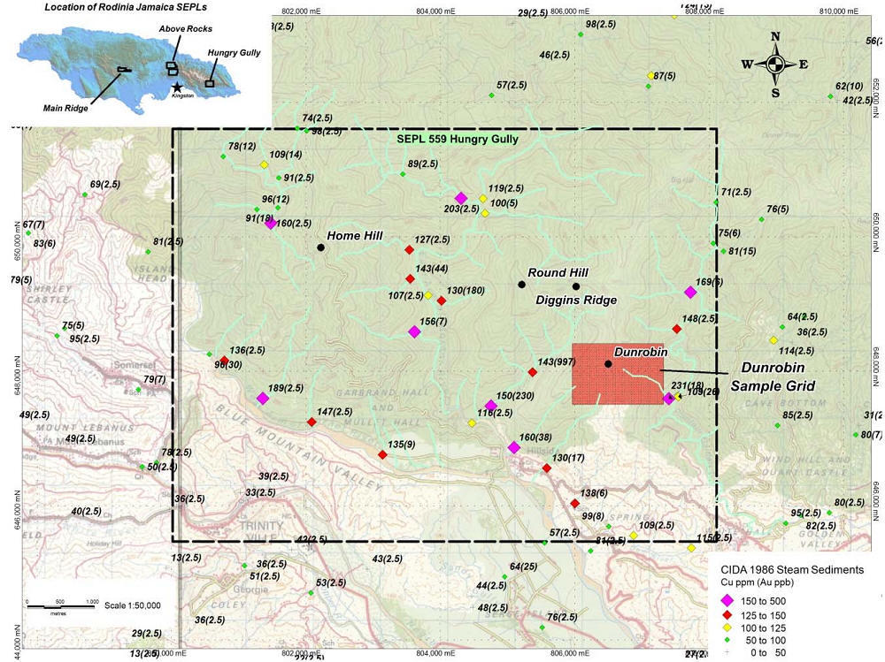 Hungry Gully. A total of 199 soil samples were collected in 2014 on a 50 metre by 100 metre grid, and subsequently analyzed to better define copper ("Cu") mineralization, previously outlined through limited ridge and spur sampling by Broken Hill Proprietary Limited (BHP) in the 1990s. Highlights of the program include: