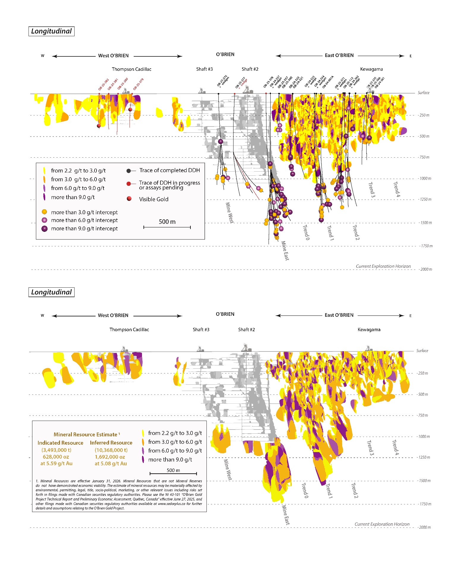 Le système de veines de quartz-sulfures aurifères d'O'Brien demeure ouvert en profondeur sur un large front sous les chantiers historiques et sous l'ERM mise à jour. La continuation potentielle de cette minéralisation jusqu'à 2 kilomètres de profondeur définit un objectif d'exploration additionnel de 5 Mt à 10 Mt à des teneurs de 4,0 à 6,0 g/t Au, contenant de 0,6 à 2,0 Moz. La quantité et la teneur potentielles d'un objectif d'exploration sont de nature conceptuelle; l'exploration est insuffisante pour définir une ressource minérale et il est incertain que des travaux d'exploration supplémentaires mèneront à la délinéation d'une ressource minérale.