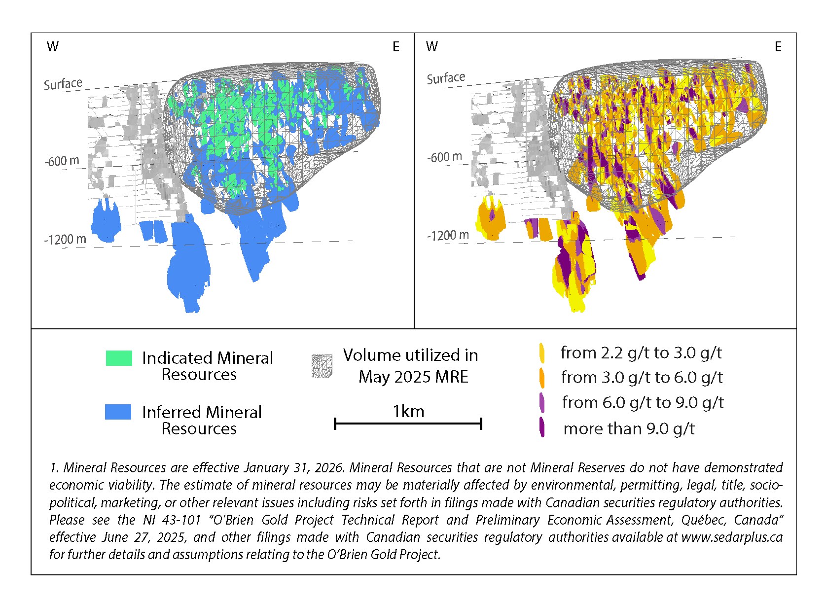 Ce communiqué de presse contient des "informations prospectives" au sens de la législation canadienne sur les valeurs mobilières applicable, basées sur des attentes, des estimations, des projections et des interprétations à la date de ce communiqué de presse. Les déclarations prospectives incluent, mais ne sont pas limitées à, des déclarations concernant la capacité de la Société à exécuter ses plans relatifs au projet aurifère O'Brien tels qu'énoncés dans l'ÉÉP; la capacité de la Société à mener à bien ses programmes d'exploration et de développement prévus; l'absence de conditions défavorables au projet aurifère O'Brien; l'absence de retards opérationnels imprévus; l'absence de retards importants dans l'obtention des permis nécessaires; le maintien du prix de l'or à des niveaux rendant le projet aurifère O'Brien rentable; la capacité de la Société à continuer de lever les capitaux nécessaires pour financer ses opérations; la capacité de réaliser les estimations des ressources minérales et des réserves minérales; les hypothèses concernant les stratégies commerciales actuelles et futures, les conditions géopolitiques et économiques locales et mondiales et l'environnement dans lequel la Société opère et opérera à l'avenir, les forages planifiés et en cours, l'importance des résultats de forage, la capacité de continuer à forer, l'impact des forages sur la définition de toute ressource et la capacité d'incorporer de nouveaux forages dans un rapport technique mis à jour et une modélisation des ressources, la capacité de la Société à développer le projet aurifère O'Brien, et la capacité de convertir les ressources minérales Présumées en ressources minérales Indiquées.