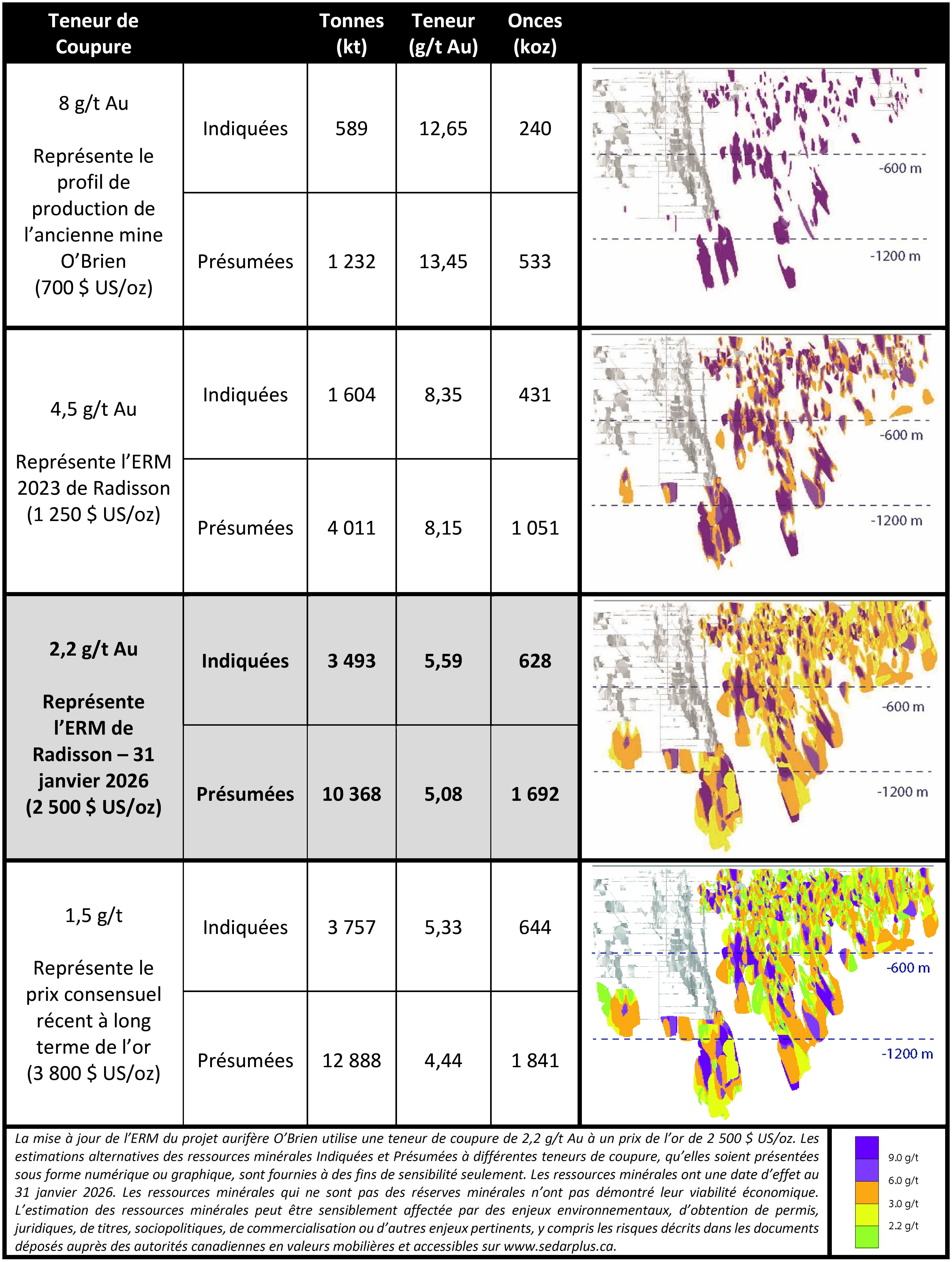 Matt Manson, président et chef de la direction : « Aujourd'hui, nous présentons la première de plusieurs mises à jour progressives planifiées de l'ERM au projet aurifère O'Brien, quantifiant l'impact de nos récents succès par forage et établissant une base claire pour une mise en valeur future selon des pratiques minières modernes. Avec seulement 25 % de notre programme de forage d'extension de 140 000 mètres complété, la nouvelle minéralisation filonienne délimitée sous les chantiers historiques et sous le volume des ressources précédentes (communiqué de Radisson daté du 12 février 2026) a entraîné une augmentation de 82 % des ressources minérales présumées, qui totalisent maintenant 1,69 Moz (10,37 Mt à 5,08 g/t Au). Parallèlement, nous avons affiné l'estimation des ressources minérales Indiquées, en intégrant davantage de tonnes à une teneur moyenne plus basse, ce qui se traduit par une hausse de 8 % des onces contenues, qui totalisent maintenant 0,63 Moz (3,49 Mt à 5,59 g/t Au). Nos estimations utilisent une teneur de coupure de 2,2 g/t Au fondée sur une hypothèse raisonnable du prix de l'or de 2 500 $ US/oz. »
