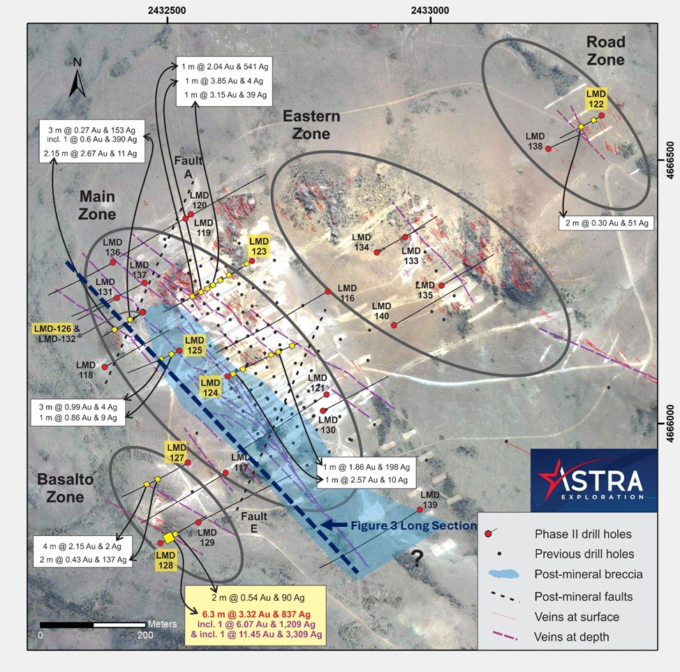 Holes LMD-127 and LMD-128 were located in the Basalto Zone and designed to test the northwestern and southeastern extensions of the initial two holes drilled in the area, LMD-105 (Phase I) and LMD-117 (Phase II), which were reported previously.