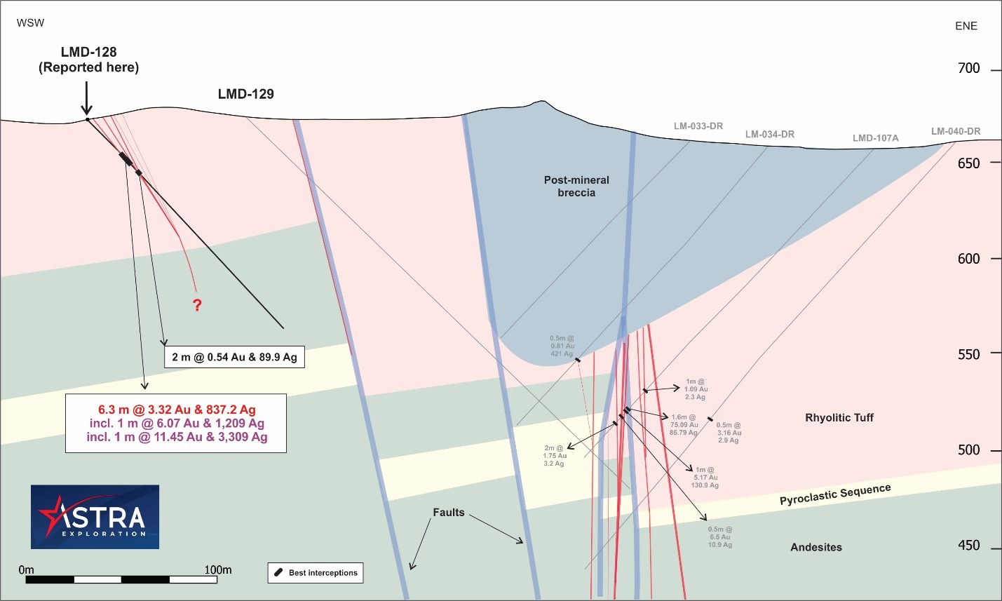 Hole LMD-128 intersected two shallow groups of silver-rich veinlets and hydrothermal breccias from 24.5 to 39 metres downhole which included 6.3 metres grading 837 g/t silver and 3.32 g/t gold (Figure 2). The vein system strikes west-northwest and dips to the east. This system remains open along strike and at depth.