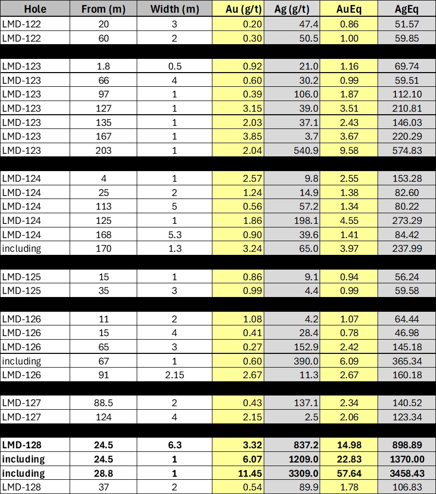 - Basalto Zone - Hole LMD-128: 6.3 metres grading 837 g/t silver and 3.32 g/t gold including