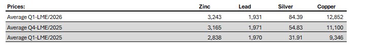 Commencing Q1 2026, the Company has improved its production disclosure by reporting Zinc Equivalent tonnes produced and has changed the method of calculating Silver Equivalent Ounces produced. The Company considers silver equivalent ("AgEq") ounces and zinc equivalent ("ZnEq") tonnes to be useful supplemental production metrics for evaluating its multi-metal production profile. These measures are commonly used in the mining industry as reference metrics to facilitate period-over-period comparisons and, where relevant, benchmarking against industry peers. They should be viewed as supplemental to, and not a substitute for, the actual metal production volumes disclosed on a metal-by-metal basis.