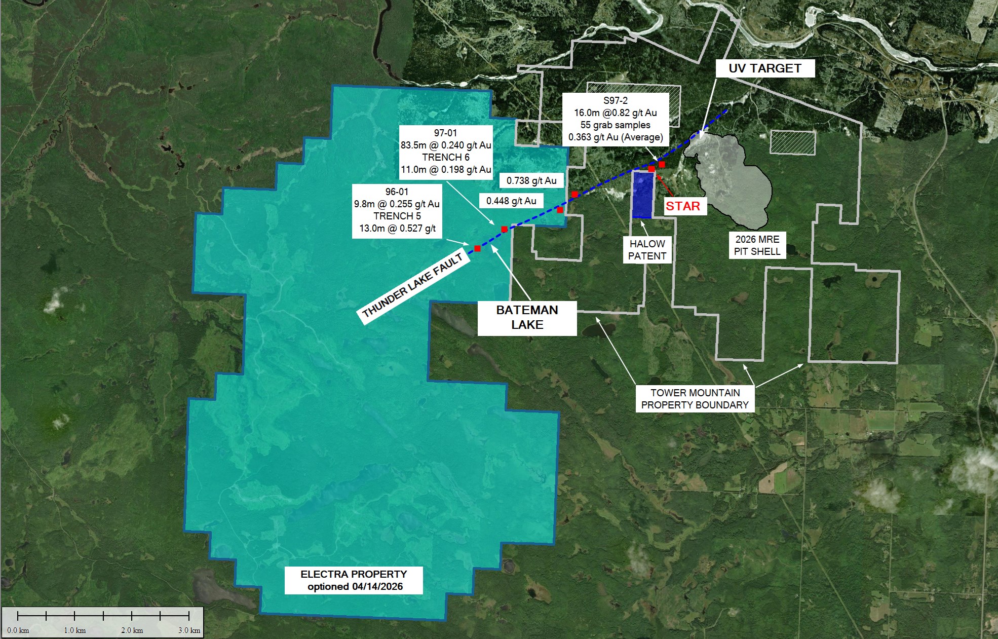 Wes Hanson P.Geo., President and CEO states: "The Star Target results, considered with those at Bateman Lake, 3.0 kilometres to the southwest, suggest potential for additional resource growth within Timiskaming conglomerate in both the original Tower Mountain claims as well as the recently optioned Electra block to the west. Grades and interval lengths are identical to those observed along the western TMIC contact hosting the current mineral resource for the property.