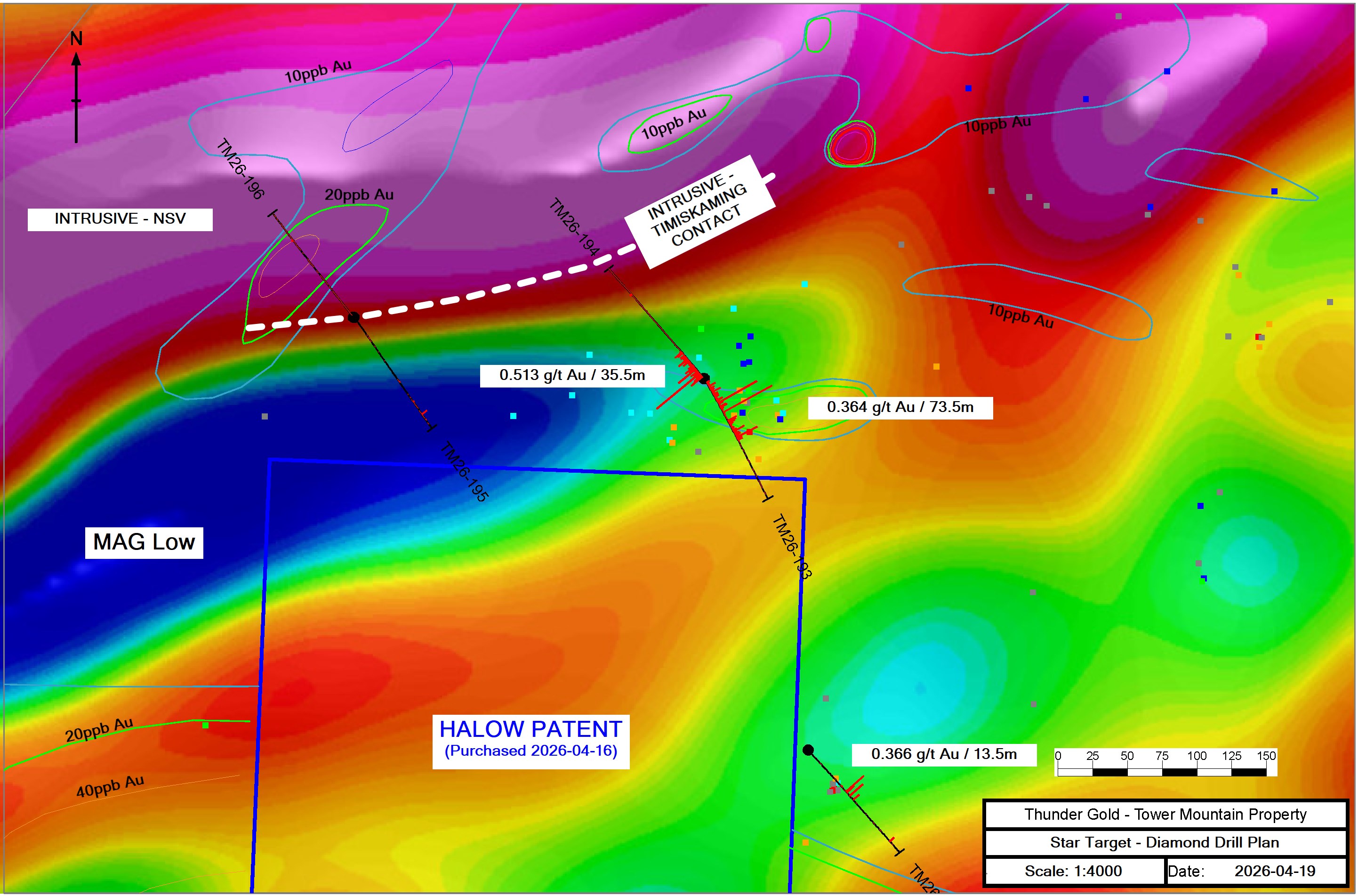 Thunder Bay, Ontario--(Newsfile Corp. - April 20, 2026) - Thunder Gold Corp. (TSXV: TGOL) (FSE: Z25) (OTCQB: TGOLF) ("Thunder Gold" or the "Company") is pleased to announce initial drill results from the 2026 drill program at the Company's flagship Tower Mountain Property in the Shebandowan Greenstone Belt, 40 kilometres west of the international port city of Thunder Bay, Ontario.